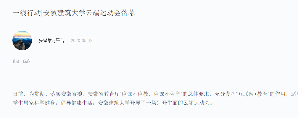编者按:近日,学校云端运动会圆满落下帷幕。515日,安徽青年报头版对此进行了报道,518日,学习强国平台进行了转载推介。