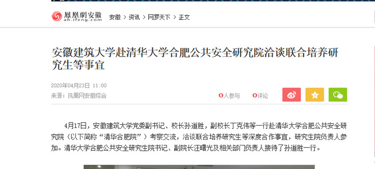 编者按:4月17日,我校党委副书记、校长孙道胜,副校长丁克伟等一行赴清华大学合肥公共安全研究院考察交流,洽谈联合培养研究生等深度合作事宜4月23日,凤凰网安徽对此进行了报道。