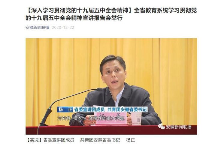 编者按:124号上午,省委宣讲团成员、团省委书记杨正来在安徽农业大学,向在肥大中专院校师生代表和合肥市中小学教师代表宣讲党的十九届五中全会精神。我校团委书记唐志敏参与了会议并接受了采访。1222日,安徽新闻联播对此进行了报道。