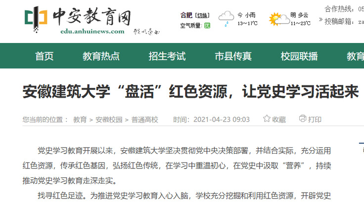 编者按:党史学习教育开展以来,学校坚决贯彻党中央、省委决策部署,持续推动党史学习教育走深走实。423日,中安在线对此进行了报道,学习强国平台进行了转载推介。