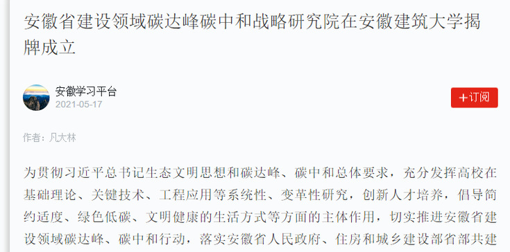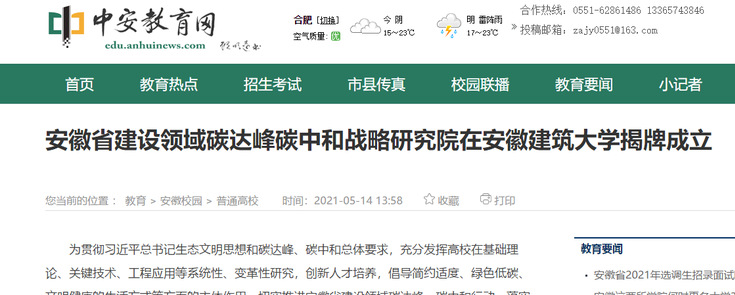 编者按:511日,我校与安徽省住房和城乡建设厅全面战略合作协议签约仪式暨安徽省建设领域碳达峰碳中和战略研究院揭牌仪式在南校区举行。514日,中安在线对此进行了报道,517日,学习强国平台进行了转载推介。