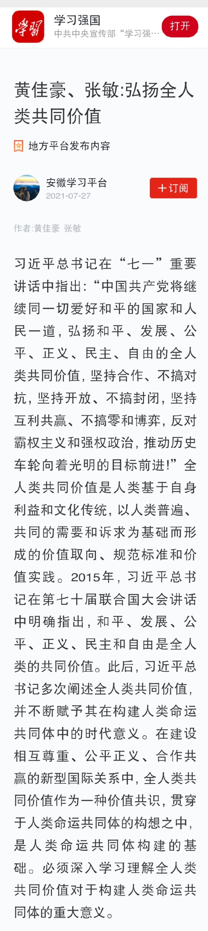 编者按  习近平总书记在“七一”重要讲话中指出:“中国共产党将继续同一切爱好和平的国家和人民一道,弘扬和平、发展、公平、正义、民主、自由的全人类共同价值,坚持合作、不搞对抗,坚持开放、不搞封闭,坚持互利共赢、不搞零和博弈,反对霸权主义和强权政治,推动历史车轮向着光明的目标前进!”为学习贯彻习近平总书记“七一”重要讲话精神,727日,《安徽日报》(理论版)刊发公管学院黄佳豪教授的《弘扬全人类共同价值》一文,同日,该文被学习强国平台全文转载推介。