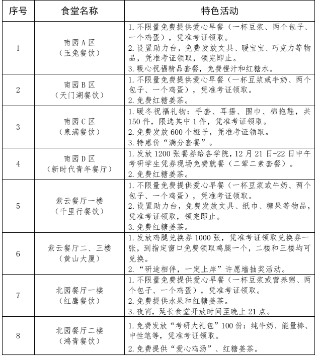 2.所有食堂增加空调开放时间,设有“研考专用”绿色窗口,考生凭准考证可刷微信二维码就餐。