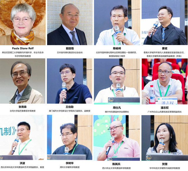 在主旨报告环节,弗吉尼亚理工大学植物与环境科学、农业与生命科学学院Paula Diane Relf教授、日本室内绿化推进协议会会长前田悟先生(李雪聪代)、台湾大学园艺暨景观学系张育森教授、澳门城市大学创新设计学院执行副院长王伯勋副教授、北京市园林绿化局林业改革发展处一级调研员陈峻崎教授级高级工程师代北京市园林绿化局副局长王小平、香港大学建筑系园境建筑姜斌副教授、南宁市风景园林学会理事长周仕凡、广州市白云山风景名胜区管理局副局长潘志权代广州市林业和园林局副局长陈迅、西北农林科技大学风景园林艺术学院副院长洪波教授、清华大学建筑学院李树华教授等十余位来自国内外园林康养领域的专家学者现场作特邀报告。四川农业大学风景园林学院陈其兵教授、华中科技大学建筑与城规学院贺慧教授分别主持。主旨报告结束后,清华大学建筑学院李树华教授为主持人,由王晓博、唐玲、卢珊珊、刘悦来、刘志云、邵丹锦、李永生7位专家学者围绕大会主题开展了嘉宾对话。李树华教授以园林康养与园艺疗法的现状、发展和未来抛出问题,嘉宾们基于不同视角,分享观点、交流经验,与会代表积极参与讨论互动,为我国园林康养与园艺疗法事业实现高质量发展出谋划策。