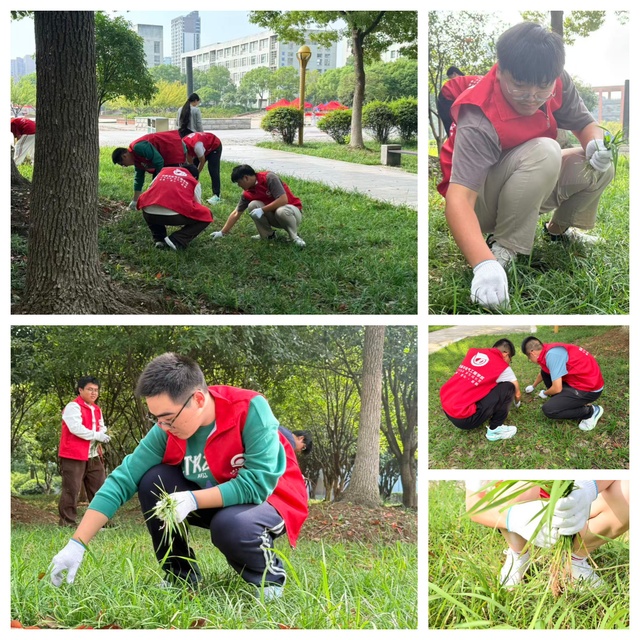在校园公共绿化区,另一组同学正仔细清理落叶和杂草。秋风微凉,汗水却早已浸湿了同学们的衣襟。2025级机械电子工程专业的吴海涛同学指着刚刚打理完的绿化带说:“看着整洁美观的校园环境,心里特别有成就感。这让我对爱校荣校有了更真切的理解。”同学们在劳动中不仅美化了校园,更增强了文明意识。